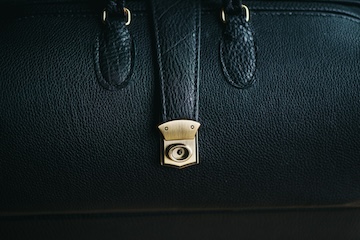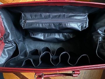 The MD bag is the largest leather bag made.  This bag features a leather exterior and sturdy construction. It has two interior zipper compartments and 8 pouches with double leather handles.  17" L x 8" W x 11"H
