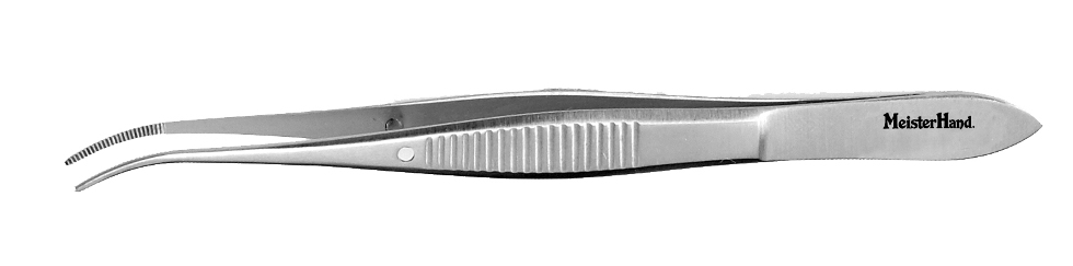 Eye Dressing Forceps, 4" (10.2 cm), half curved, standard pattern, 0.8 mm wide serrated tips
